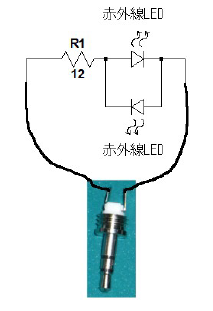 まず、スマートフォンのヘッドホン出力のLchとRchの間に、「2個の赤外線LEDを互いに逆極性に接続し、12Ωの抵抗を直列接続したもの」を接続します。